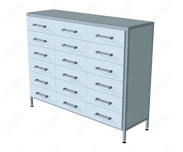 Шкаф используется для хранения документации, химреактивов и расходного материала. Предусмотрено 18 выдвижных металлических ящиков.